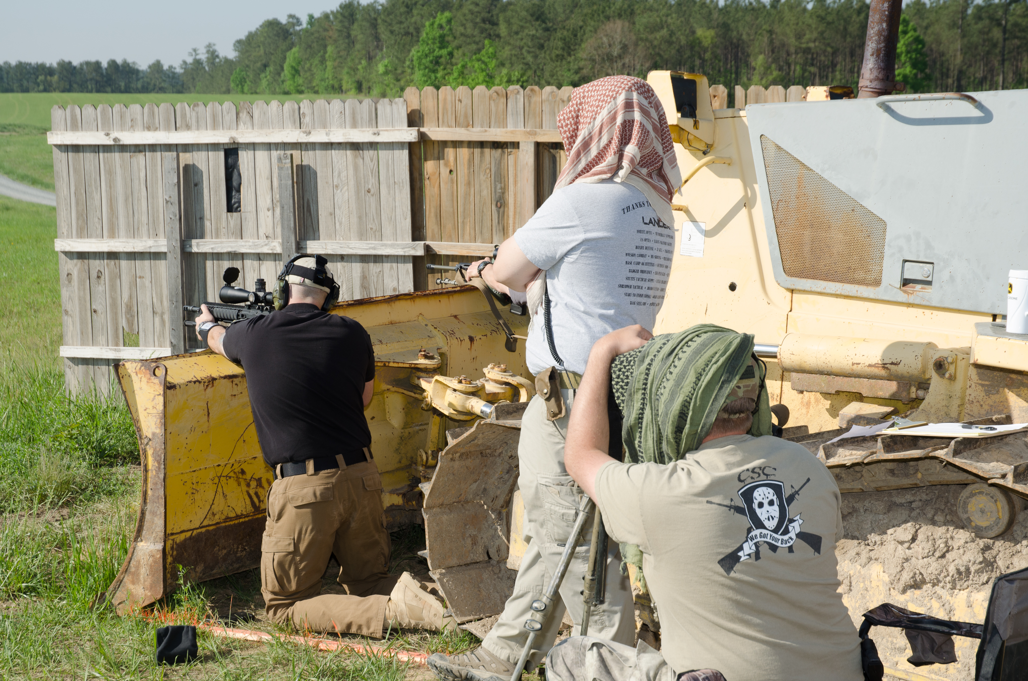Stage 3 was titled “Helo Pad Contruction Under Attack”. Shooter One starts on the left side of a bulldozer with his butt on the track. His rifle is leaning against the back of the blade with a magazine inserted and empty chamber. Shooter Two is in the same position on the right side of the ‘dozer. On the start signal, Shooter One engages the rifle targets from 183 to 550 yards. Once he is done, Shooter One clears his rifle. Shooter Two can then engage his targets. Shooter are allowed to spot for their teammate with their rifles. The shooters cannot move past the “fault line” which denotes hard cover from the bulldozer blade. Shooters were allowed 300 seconds to shoot the stage.