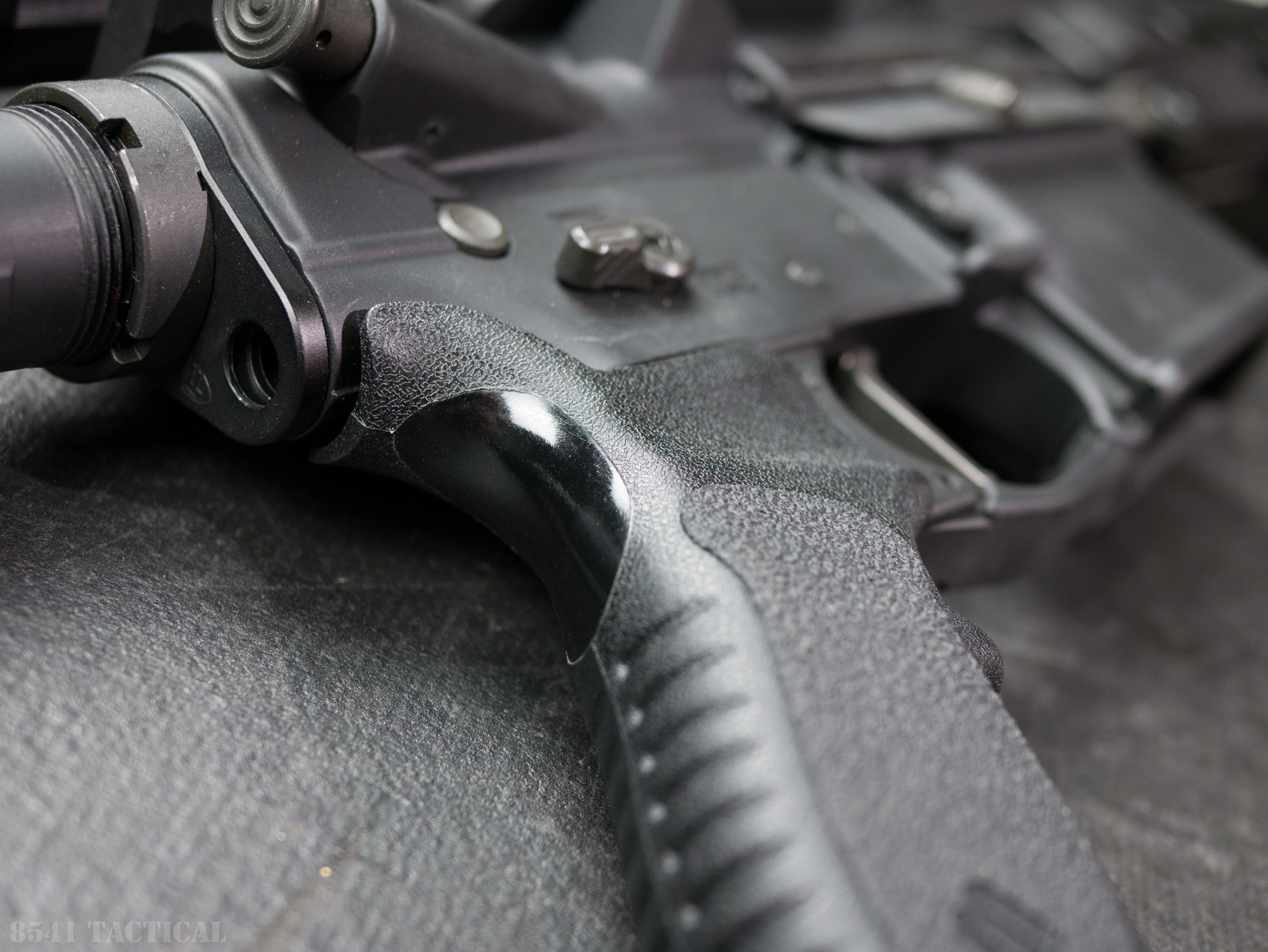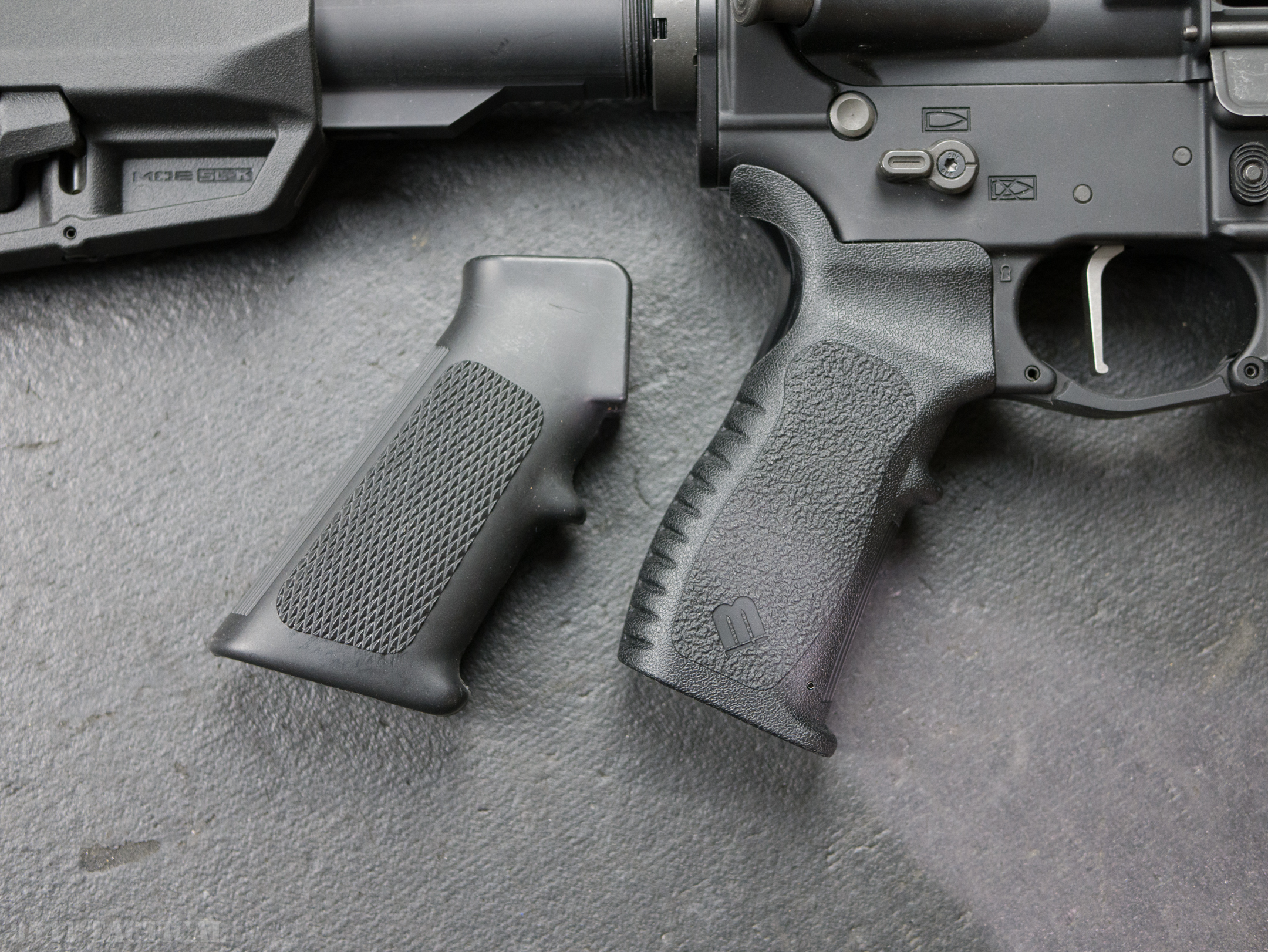 The M-Series grip is a well thought out AR15 pattern grip. The angle is somewhat less than the A2 grip. The front of the grip has vertical ribs and the rear has horizontal ribs. The texturing on the side of the grip panel is fairly aggressive. There should be no need to stipple the M-Series Grip in this location.