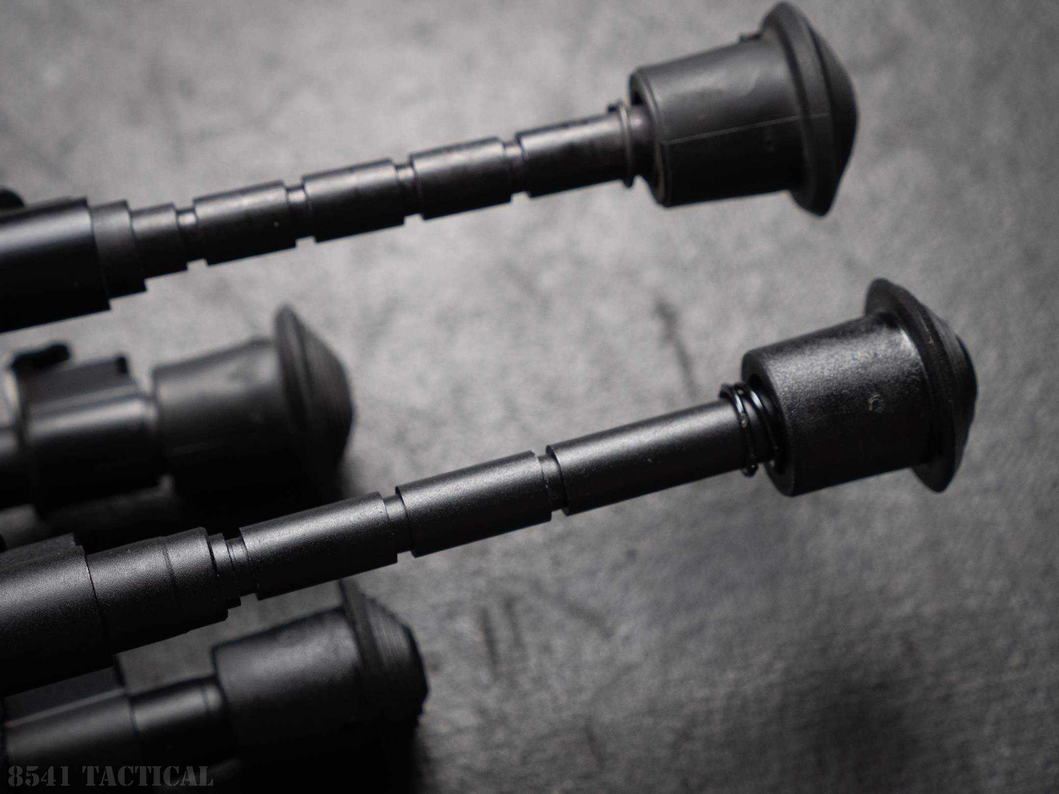 The feet on the two bipods have a very similar shape, but the rubber on the XLA is harder and not as “grippy” on many surfaces. They both use the same roll-pin mounting method. The shaft is only slightly smaller on the XLA (0.374″ vs. 0.377″). This means that many claws, spikes or other feet options for the Harris may fit the XLA.